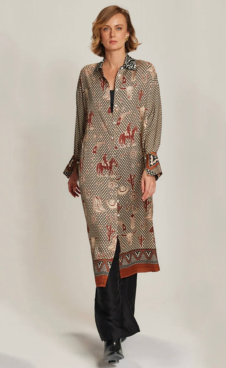 Midi length button up collar dress. Long sleeve with wide contrasting cuffs. You can wear this dress by itself or layer it over savannah pants for a different look. An artistic, versatile piece.