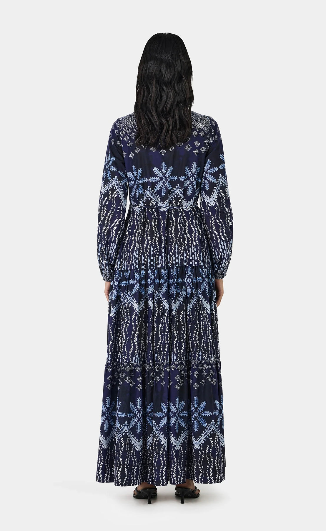 The Nia Dress is a maxi length dress with long sleeves, elasticated cuffs and a flared, gathered skirt. The dress features a button-down centre front with rouleau loop detailing and a waist tie to define the silhouette. An effortless piece for elevated everyday dressing or special occasions.