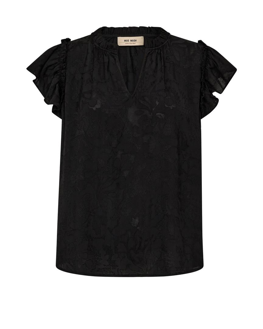 This feminine jacquard blouse is a real eye-catcher. It is designed in a slightly loose silhouette with a flattering V-neck and a beautiful tone-on-tone floral print that plays elegantly between matte and shiny shades. The blouse is finished with delicate ruffle details at the neckline and sleeves, which add a romantic touch.