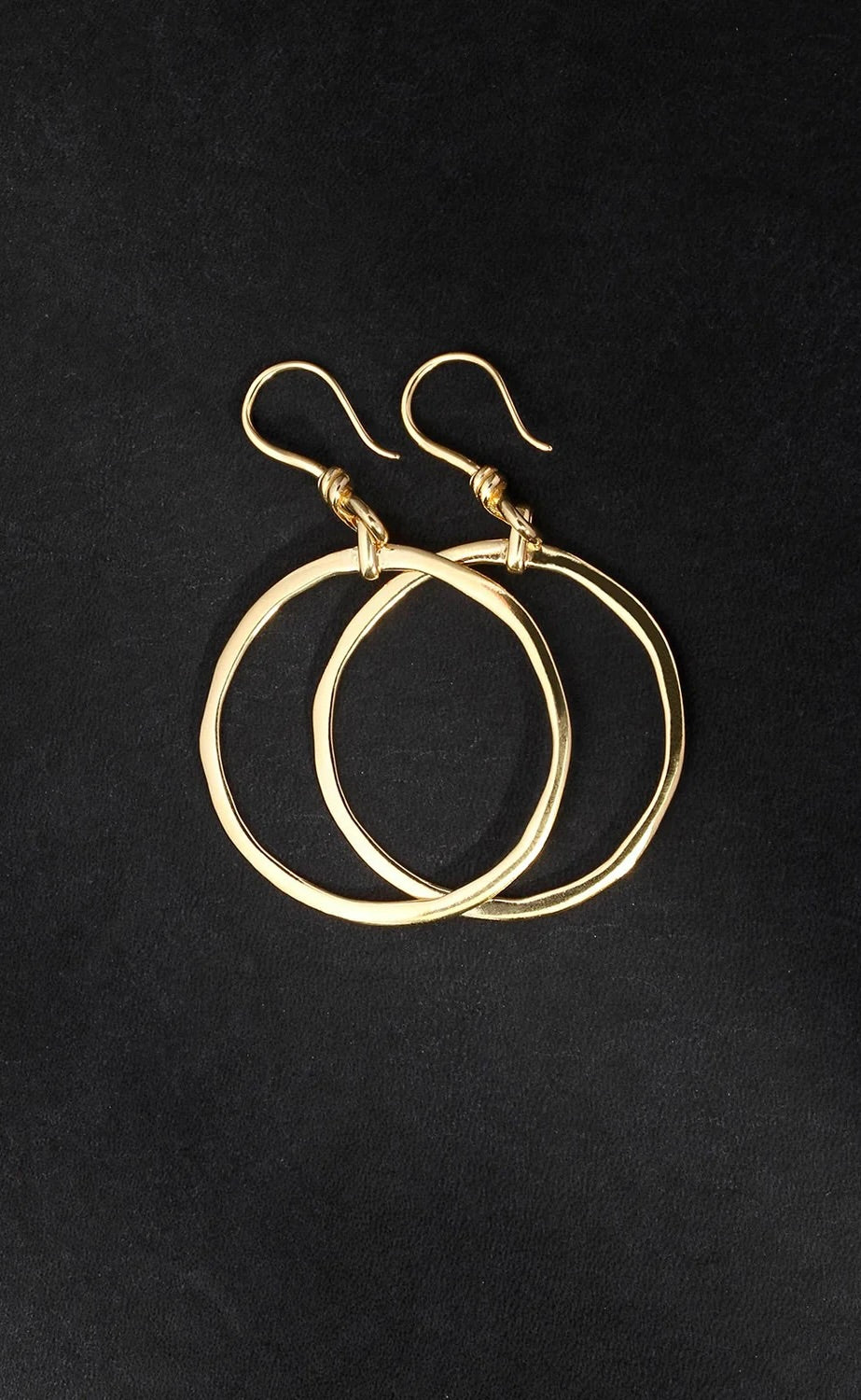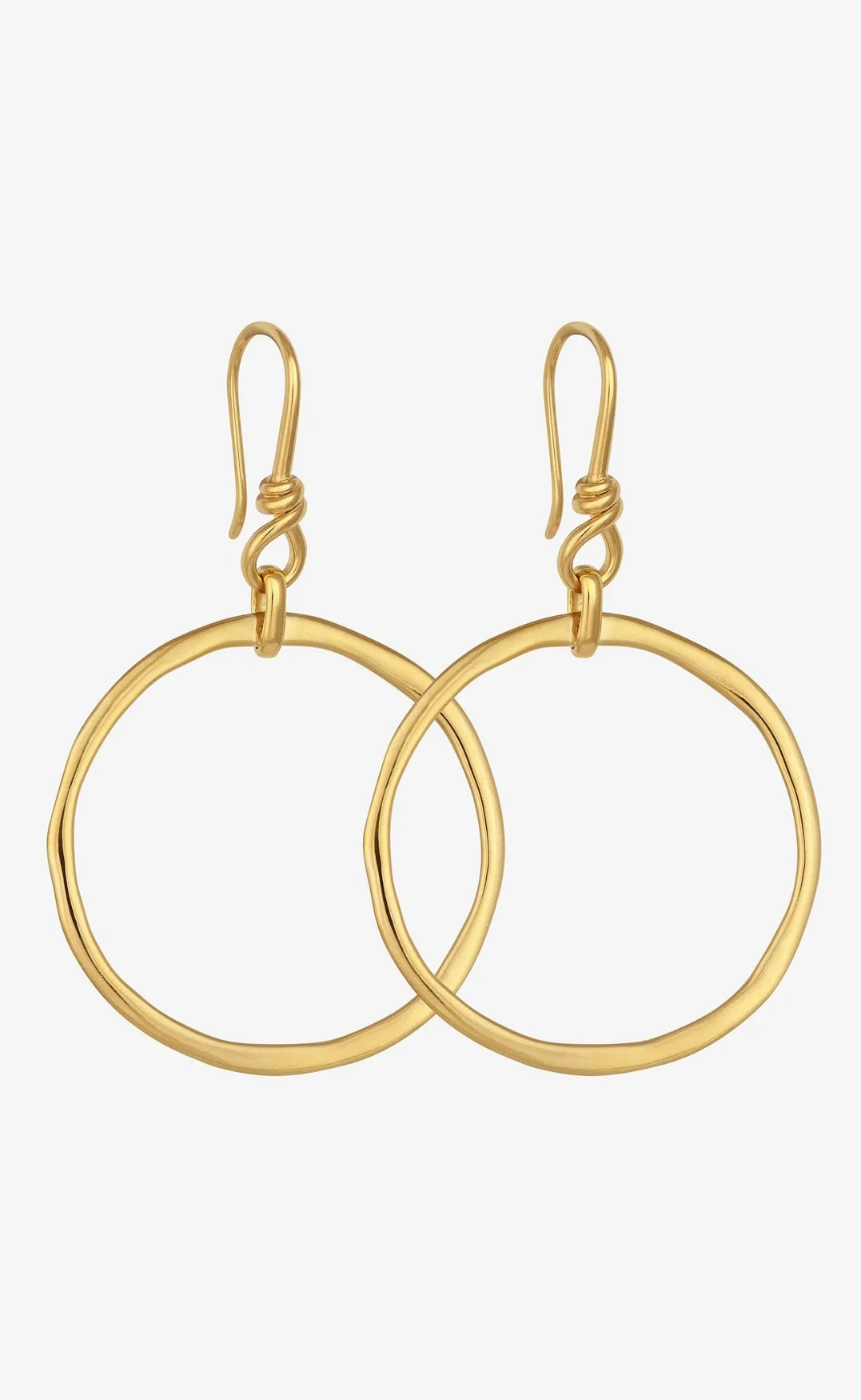 The Circe Earrings are highly polished 18k gold vermeil statement earrings featuring large rings, suspended from shepherd's hooks with a wire-wrapped detail.