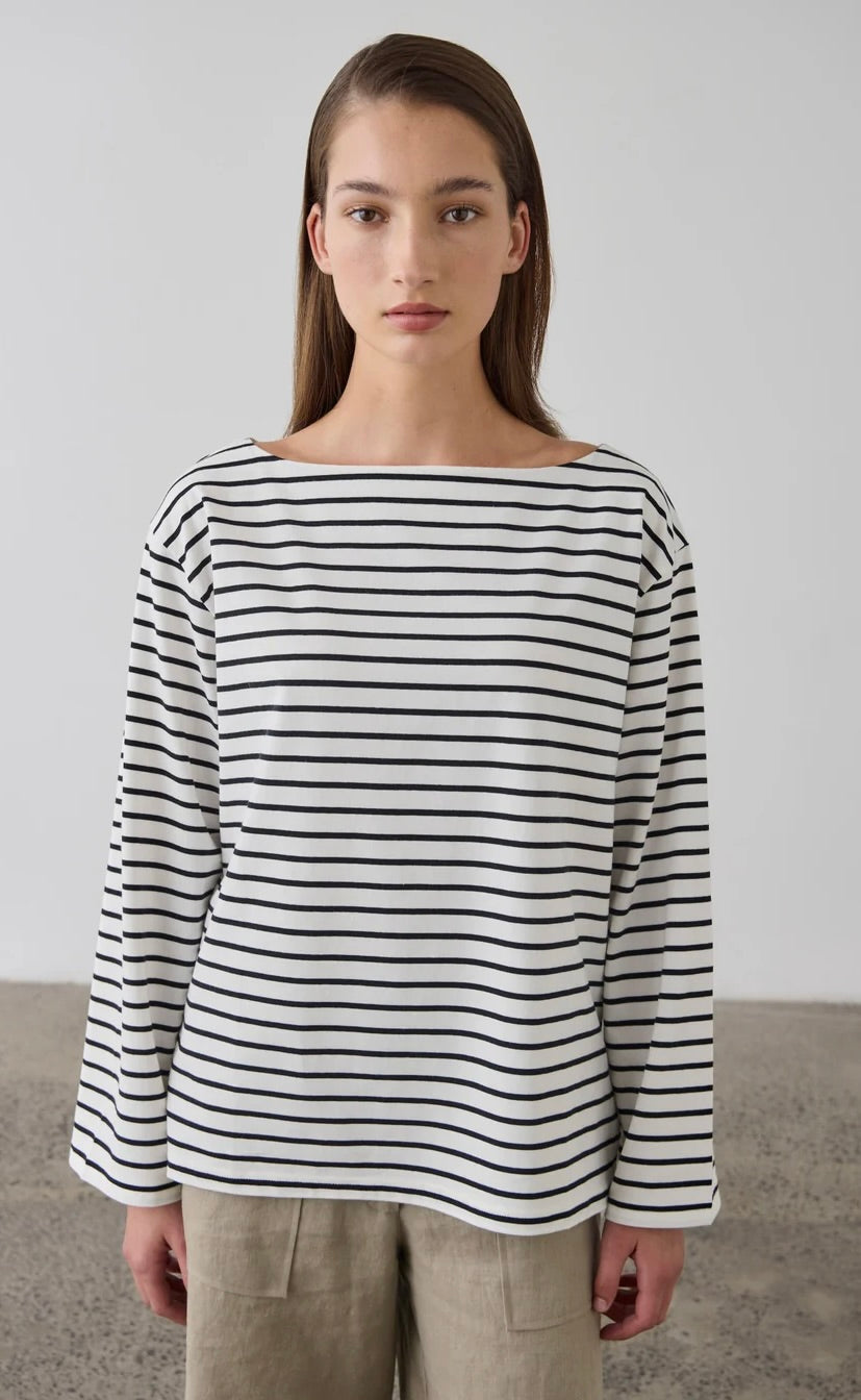 Inspired by the easy glamour of the Cote d'Azur, this striped sweatshirt brings relaxed structure to off-duty dressing. Cut in a boxy silhouette with a clean boat neckline and side slits for movement, it's equal parts refined and laid-back.