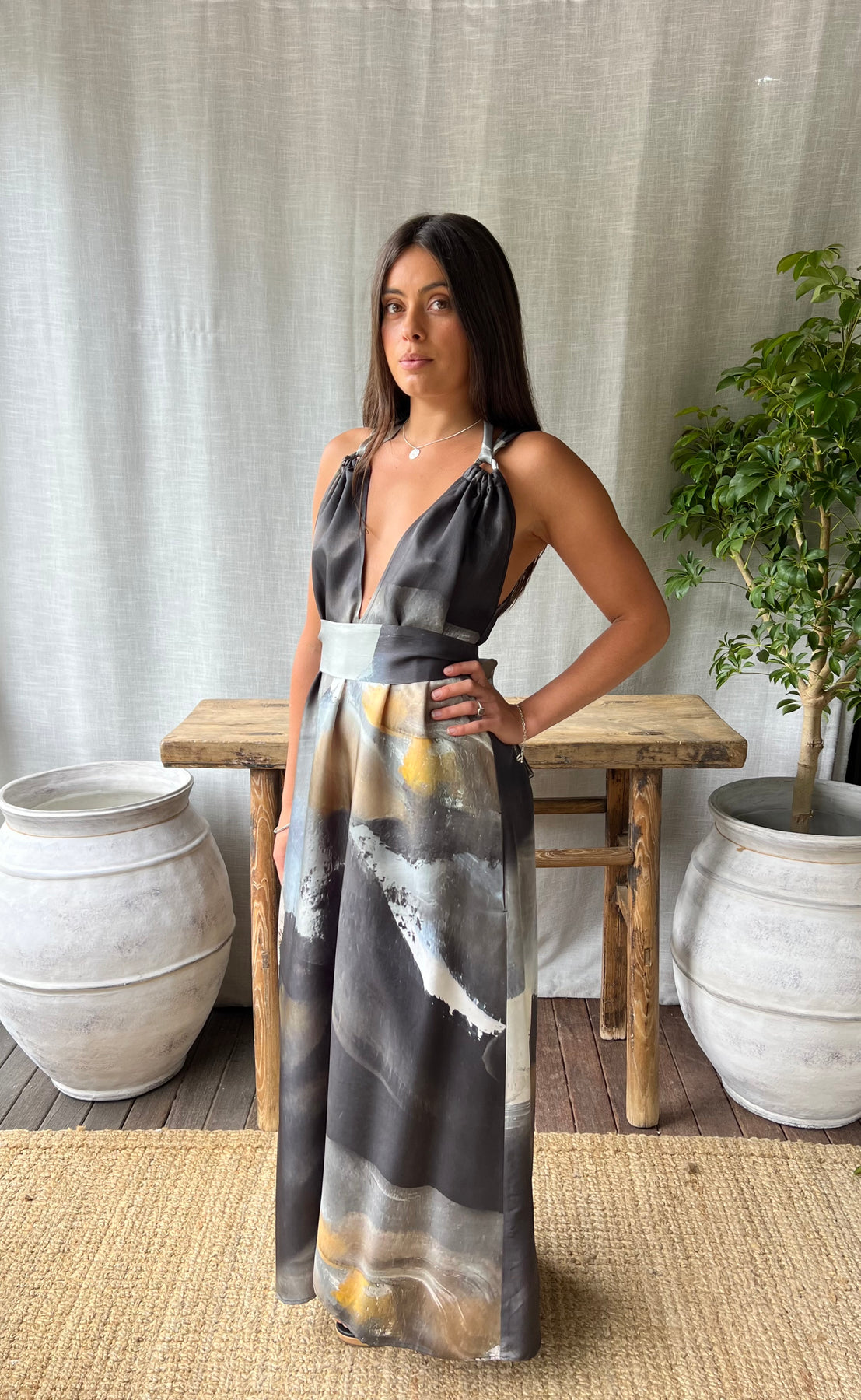 Designed to be reversible ( because we love variety on one garment), This relaxed fit maxi dress has side pockets, wide neckties for more coverage, and an additional waist/ hip sash.