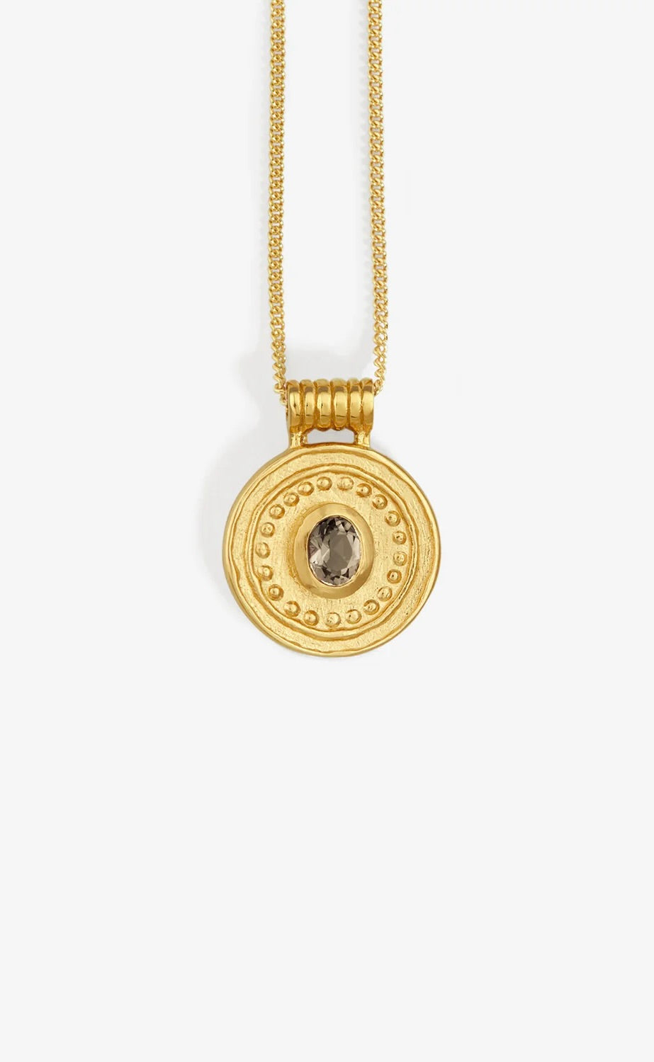 Named after a Roman coin denomination, this 18k gold vermeil coin pendant is set with an oval rose-cut smoky quartz, symbolising grounding, transformation & manifestation.