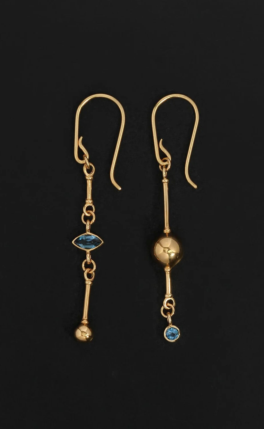 Crafted from 18k gold vermeil, the Ula Statement Earrings feature polished bars accented with golden orbs and teal blue topaz. Their asymmetrical form catches the light like sun on water, shimmering with the movement and colours of the sea.